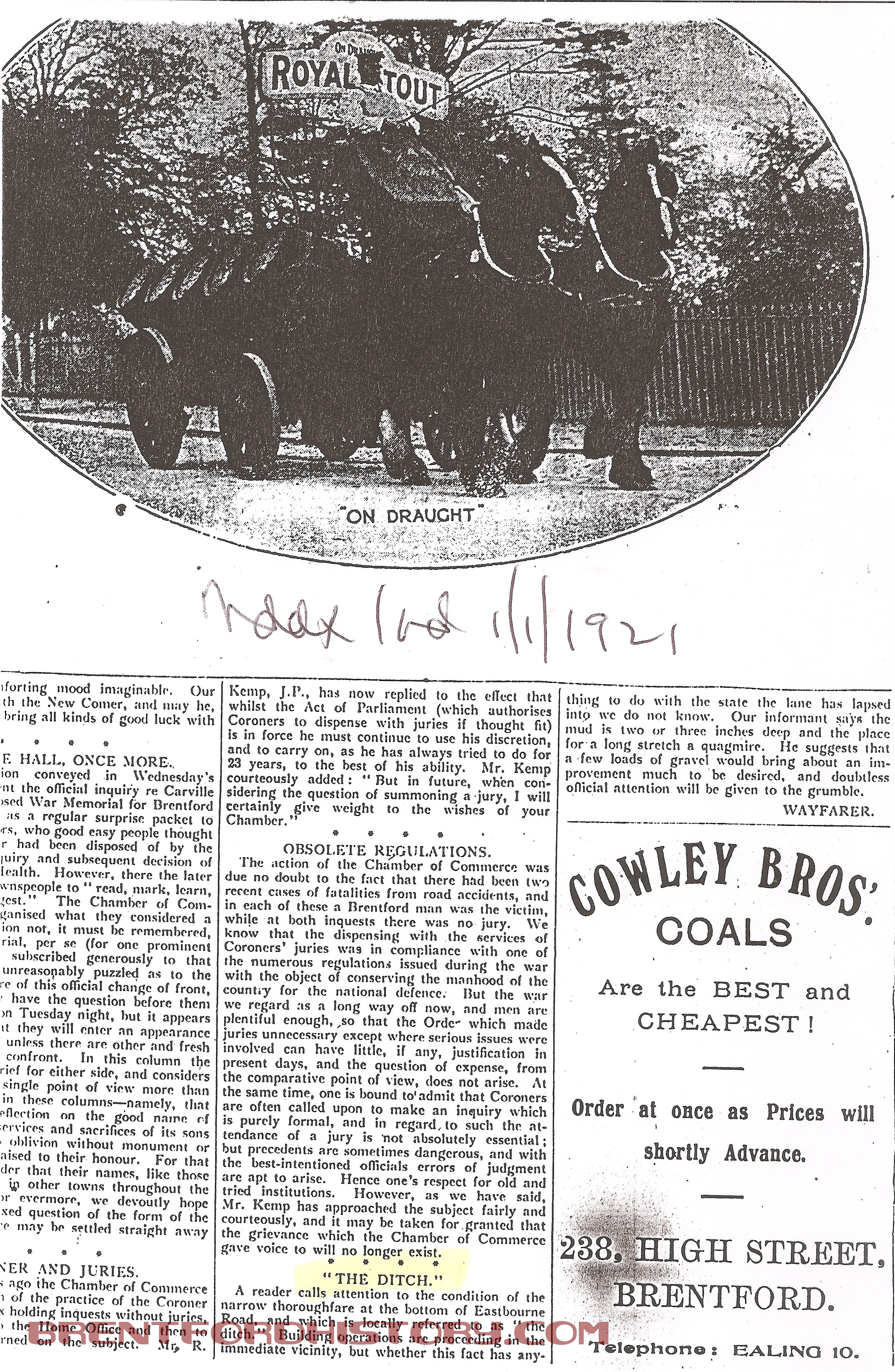 A reader calls attention to the condition of the narrow thoroughfare at the bottom of Eastbourne Road, and which is locally referred to as “the ditch”. Building operations are proceeding in the immediate vicinity, but whether this fact has anything to do with the state the lane has lapsed into we do not know. Our informant says the mud is two or three inches deep and the place for a long stretch a quagmire. He suggests that a few loads of gravel would bring about an improvement much to be desired, and doubtless official attention will be given to the grumble.